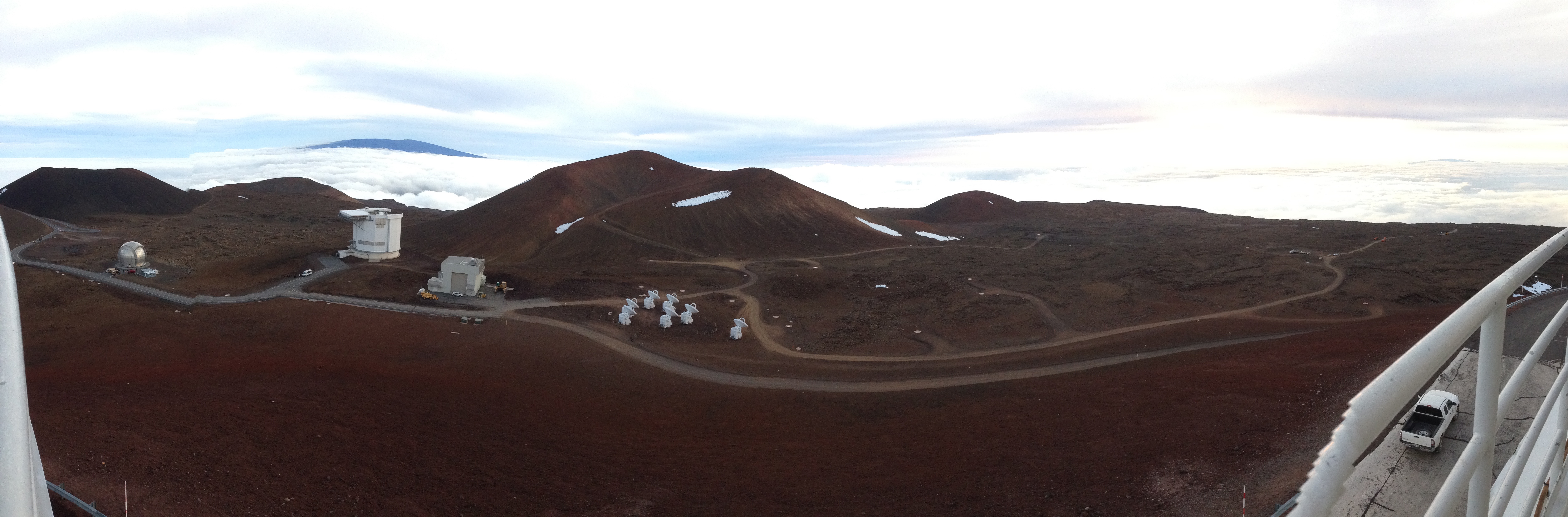 View of the Submillimeter Valley from the Subaru Catwalk. The SMA (SubMillimeter Array is visible). Also the James Clerk Maxwell Telescope (JCMT; white building with flat roof) and now defunct Caltech Submillimeter Observatory (CSO) (silver dome)