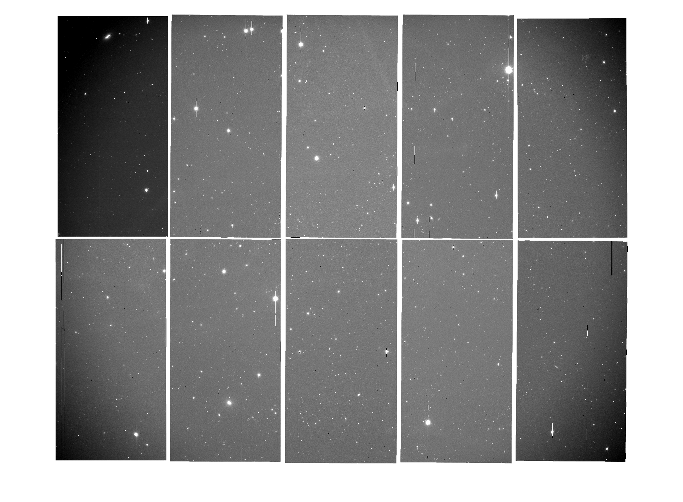 Suprime-Cam is equipped with 10 CCDs (charged coupled devices) that actually receive the photons and and are read out to produce the images we show on Comet Hunters. Subaru has two rows of 5 CCDs. You can rotate the direction of the camera as well. If you display all 10 CCDs from a single observation it looks something like this if you have the widest part of the camera along the East-West direction (for Right Ascension). If the full moon was imaged it would fill most of the imaging plane: