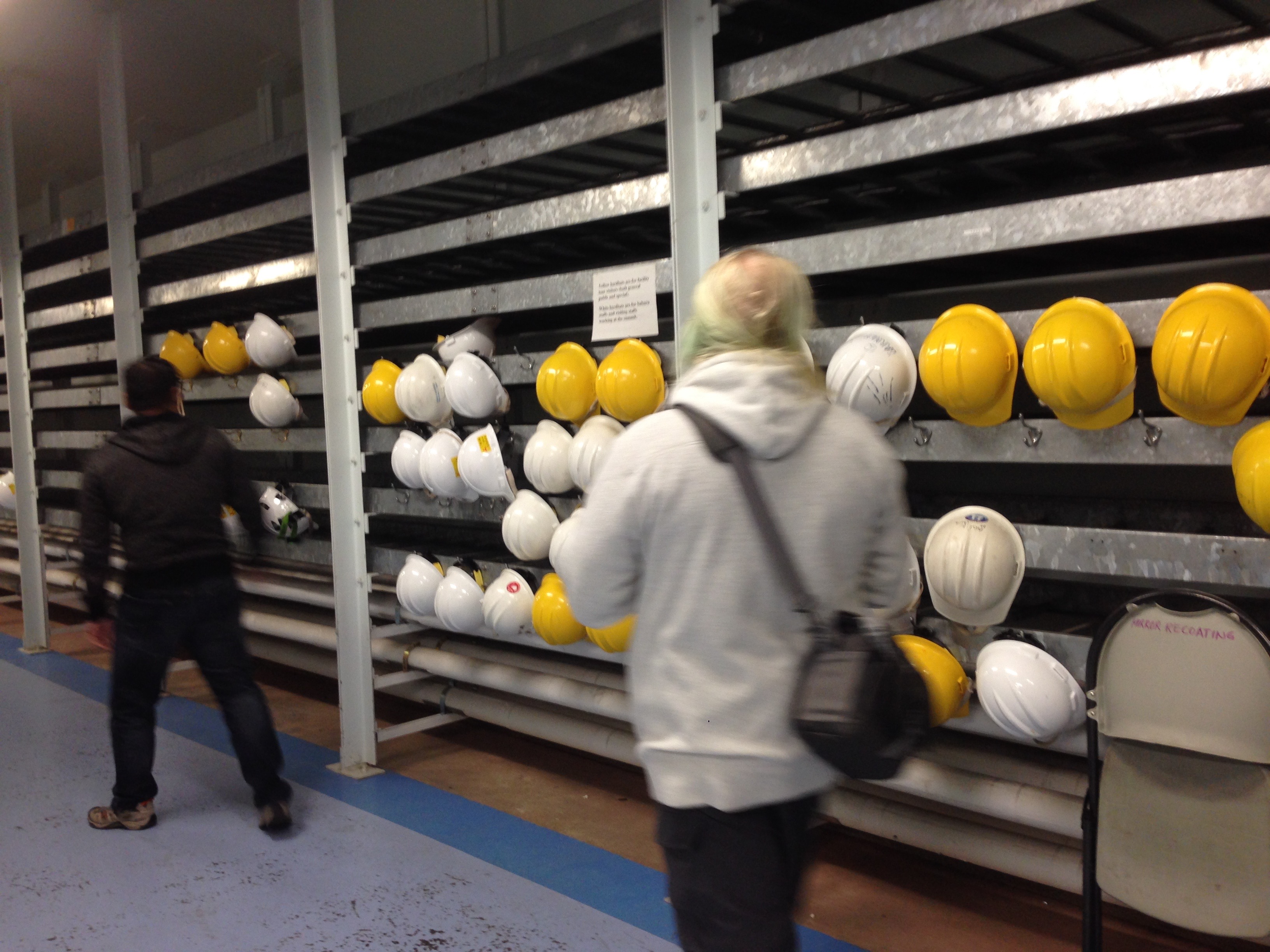 hard hats in the hallway betwen the controll room and the Subaru telescope dome (plus some astronomers!)
